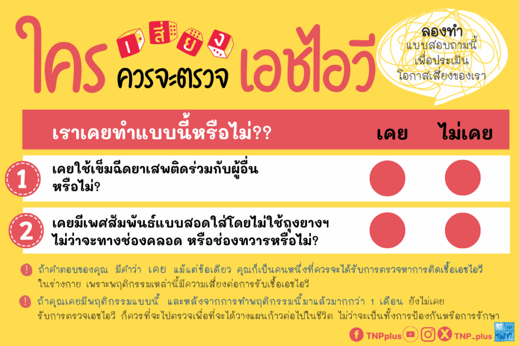 1. คนที่มีพฤติกรรมเสี่ยงสามารถขอรับการตรวจหาแอนติบอดี (Anti-HIV) ปีละ 2 ครั้ง