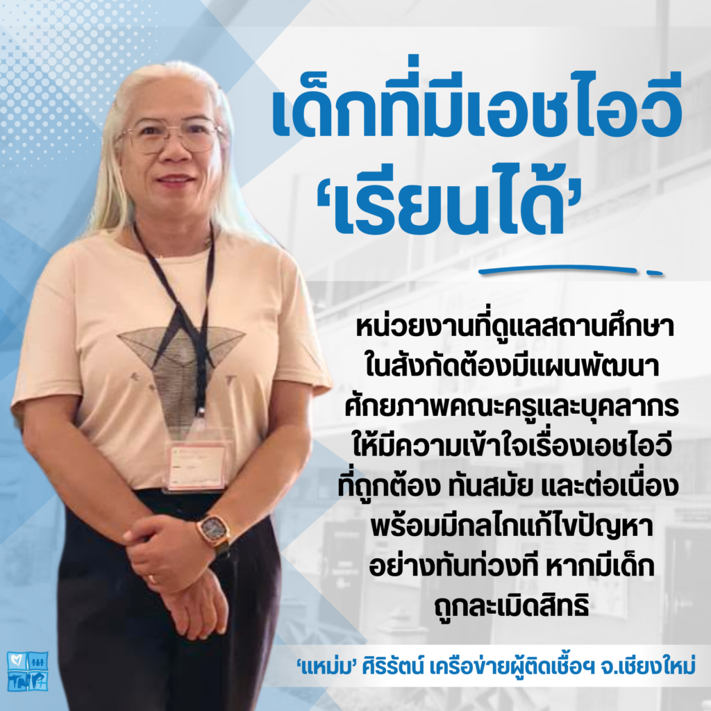 เมื่อประมาณเดือนมิถุนายน 2568 ‘พี่แหม่ม’ ศิริรัตน์ เครือข่ายผู้ติดเชื้อฯ จ.เชียงใหม่ ได้รับเรื่องร้องเรียนจากมูลนิธิแห่งหนึ่งที่เป็นสถานสงเคราะห์รับเลี้ยงเด็กกำพร้าใน จ.เชียงใหม่ ว่ามีเด็กที่อยู่ความดูแลคนหนึ่งถูกโรงเรียนหลายแห่งไม่รับเข้าเรียนเพราะรู้ว่ามีเชื้อเอชไอวี จึงอยากให้หาวิธีช่วยเด็กได้เข้าเรียนในโรงเรียนเหมือนกับเด็กนักเรียนคนอื่นๆ