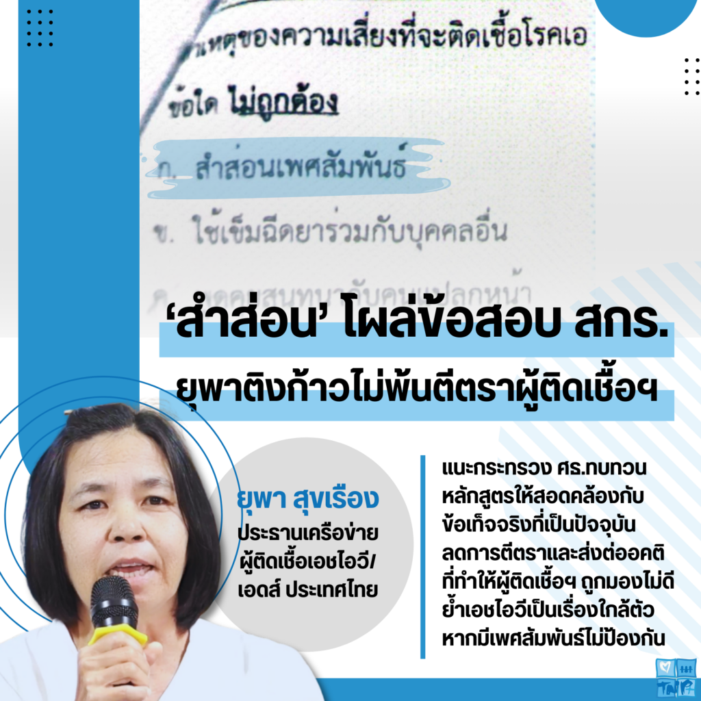 พอทำข้อสอบเสร็จยุพาจึงถ่ายรูปข้อสอบเก็บไว้ แล้วเอามาคุยกับครู ศสกร.ที่มาสอนว่า ทำไมข้อสอบยังใช้คำโบราณเหมือนเมื่อก่อน ครูอธิบายว่าข้อสอบมาจากส่วนกลาง คนที่ออกข้อสอบก็จะคัดครูจากที่ต่างๆ ไปคิดข้อสอบซึ่งอาจไม่ได้เข้าใจเรื่องสิทธิด้านเอดส์แบบลึกซึ้งเหมือนคนที่ทำงานด้านนี้โดยตรง แต่ในมุมของยุพาคาดหวังว่าถ้าเป็นหน่วยงานด้านการศึกษาที่เป็นผู้ชี้นำความคิดของคน ควรอัปเดตความรู้ใหม่ๆ อยู่เสมอ ไม่ใช่แช่แข็งความรู้เหมือนข้อสอบเก่าที่ผ่านมาแล้วกว่า 20 ปี ยิ่งพอมาเห็นคำว่า ‘สำส่อน’ โผล่มาในข้อสอบ ก็รู้สึกเลยว่าหน่วยงานของรัฐเองนั่นแหละที่ยังคงตีตราเรื่องเอดส์แบบเดิมๆ อยู่ และยังส่งต่ออคติที่ไม่ถูกต้องจากรุ่นสู่รุ่นแบบฝังรากลึกจนขุดออกได้ยาก