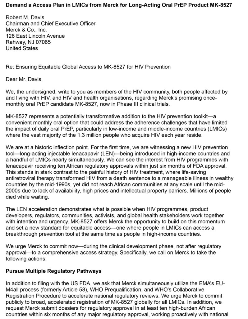 เครือข่ายผู้ติดเชื้อเอชไอวี/เอดส์ ประเทศไทย ร่วมกับเครือข่ายนักเคลื่อนไหวด้านเอชไอวี องค์กรภาคประชาสังคม และองค์กรด้านสาธารณสุขทั่วโลก ส่งข้อเรียกร้องไปยังบริษัท Merck & Co. (เมิร์กแอนด์โค) ผู้เป็นเจ้าของยา MK-8527 (เอ็มเค-8527) ที่ใช้เป็น “ยาเพร็พ” แบบกินเดือนละครั้ง ที่ตอนนี้กำลังอยู่ในการทดลองทางคลินิกขั้นสุดท้าย หากสำเร็จจะเป็นความก้าวหน้าอีกหนึ่งทางเลือกที่สร้างการเปลี่ยนแปลงสำคัญในการป้องกันการติดเชื้อเอชไอวีนอกเหนือไปจากการใช้ยาเพร็พแบบทานทุกวัน โดยเฉพาะการใช้ในประเทศรายได้น้อยและปานกลางที่ยังคงมีผู้ติดเชื้อรายใหม่เป็นจำนวนมาก
