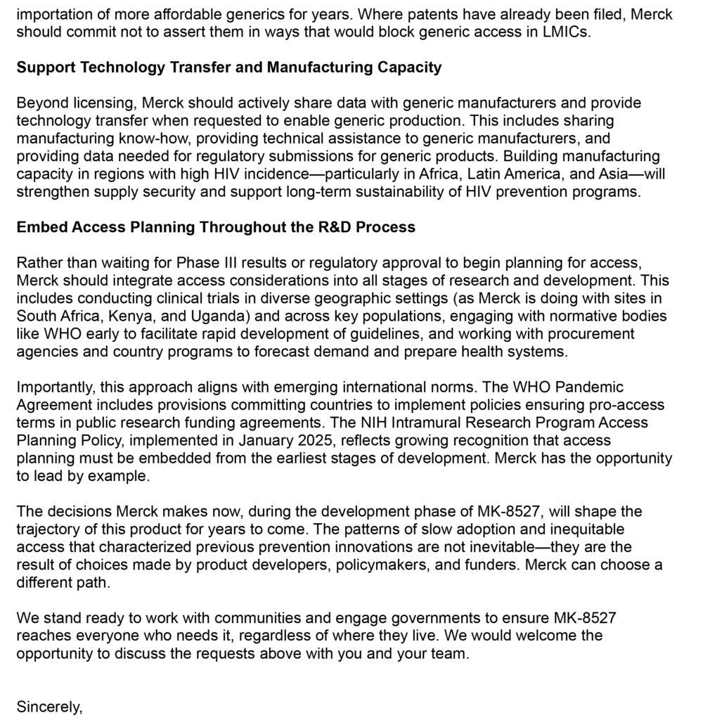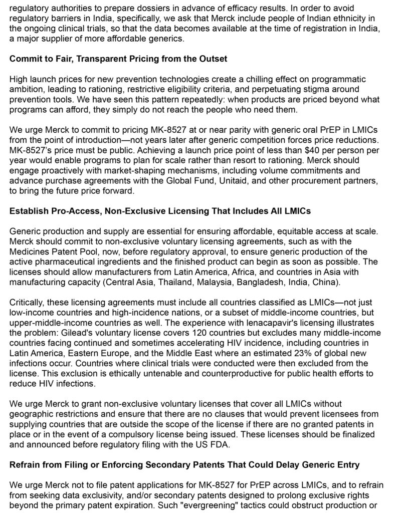 ข้อเรียกร้องสำคัญที่องค์กรภาคประชาสังคมจากหลายประเทศได้ร่วมกันส่งจดหมายเปิดผนึกไปยังผู้บริหารของบริษัทยาข้ามชาติ Merck มีดังนี้: